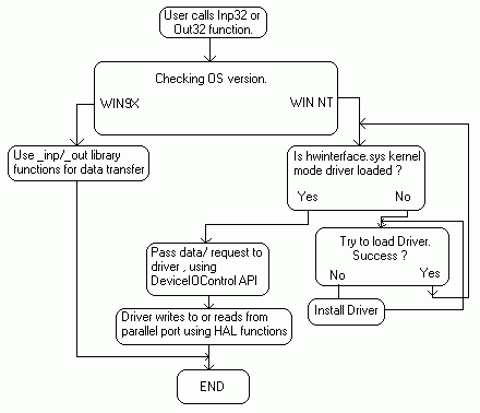 The outstanding feature of Inpout32.dll is , it can work with all the windows versions without any modification in user code or the DLL itself. This tutorial describes how it is achieved, what programming methods used, what are the APIs used, etc.... The Dll will check the operating system version when functions are called, and if the operating system is WIN9X, the DLL will use _inp() and _outp functions for reading/writing the parallel port. On the other hand, if the operating system is WIN NT, 2000 or XP, it will install a kernel mode driver and talk to parallel port through that driver. The user code will not be aware of the OS version on which it is running. This DLL can be used in WIN NT clone operating systems as if it is WIN9X. The flow chart of the program is given below.