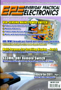 This useful accessory powers up your computer peripherals automatically and powers down devices when PC sleeps. By monitoring a USB port, it detects activity and turns other mains-powered accessories on (or off, when your system hibernates). Configurable for either desktop PC or laptop operation. Main relay output, straightforward 555 and TTL design. As usual, all constructional details are included in full colour along with full photography enabling you to construct this design with confidence.