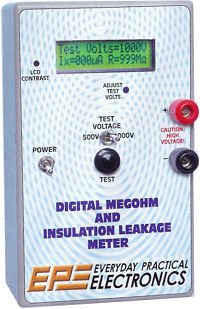 This digital display megohm and leakage current meter (megger tester) allow you to test for insulation or leakage problems at either 500V or 1000V. It measures insulation resistances up to 999M and leakage currents below 1µA. PIC MCU based, 16 x 2 character LCD readout, switchable 500V/ 1000V test voltages. 6V dc battery operation.