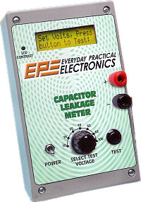 This PICmicro powered test gear lets you perform a leakage current test on almost any type of capacitor, including ceramic, polyster, mica, tantalum or aluminium electrolytics. Seven standard test voltages are available from 10V to 100V allowing most capacitors to be tested at their rated voltage. Leakage currents from 100nA to almost 10mA can also be tested. Informative LCD alphanumeric display all in a self-contained unit. Capacitor Leakage Current Guide Table also included.