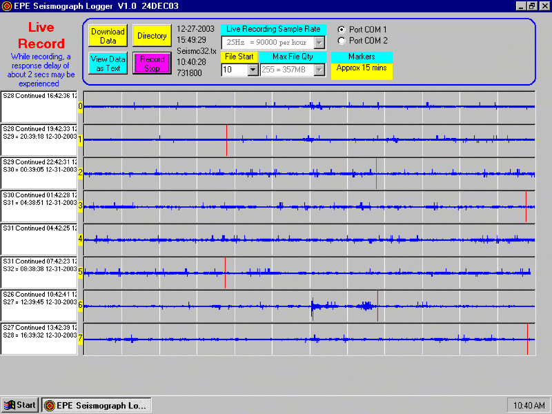 Experimental Seismograph Logger (2) The second article discusses the software and use of our long term data logger. Free Windows software enables our circuit to run on a compatible PC. Screenshot.