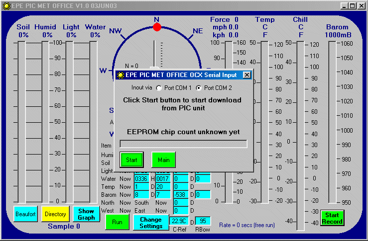 EPE 'PIC' Met Office - EPE does it again! Our very latest PIC-powered 'Met Office' Weather Station (so-called after the UK Gov't Meteorological Office) is a fabulous all-solid state weather monitoring and data logging project that's guaranteed free from salty seaweed and old proverbs! The EPE PIC Met Office measures a wide variety of parameters, including: Barometric pressure in millibars | Temperature in Celsius and Fahrenheit | Relative Humidity %RH | Soil Mositure % | Light Intensity % | Rain Fall immediate and trends | Wind Speed in kph, mph, Beaufort Scale | Wind Direction | Wind Chill Factor | Possible Rainbow Alert!
