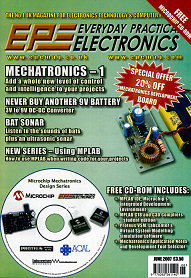 Also in this issue: The Power of Mechatronics (Part 1) - adding a whole new level of control and intelligence to your projects. PIC n MIX reviews Microchip's PICkit2. Circuit Surgery outlines step-up converters using transfomers. Feature: Using MPLab - Part 1. Interface - more on Windows Vista compatibility. Net Work - the Internet page - on buying from the USA and taking advantage of exchange rates. All this and a free CD, in the June 2007 issue of Everyday Practical Electronics.