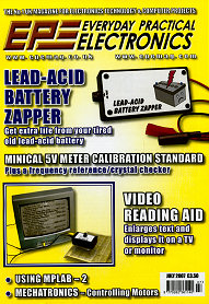 This issue also includes The Power of Mechatronics (Part 2) - controlling motors. Practically Speaking - our handy hints page on semiconductor identification. Circuit Surgery Linear Voltage Regulators and Capacitors (Part 1). Using MPLAB (Part 2); Net Work - the Internet page on the benefits of importing direct from the USA. Ingenuity Unlimited - readers' own circuit ideas.