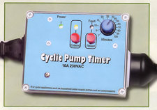 It has switching contacts rated at 30A and a run-time of 1-100 minutes as a cyclic pump timer, or 2.5-250 minutes as a simple period timer. PIC 12F675 controlled with source code available from our web site (see link, top right).