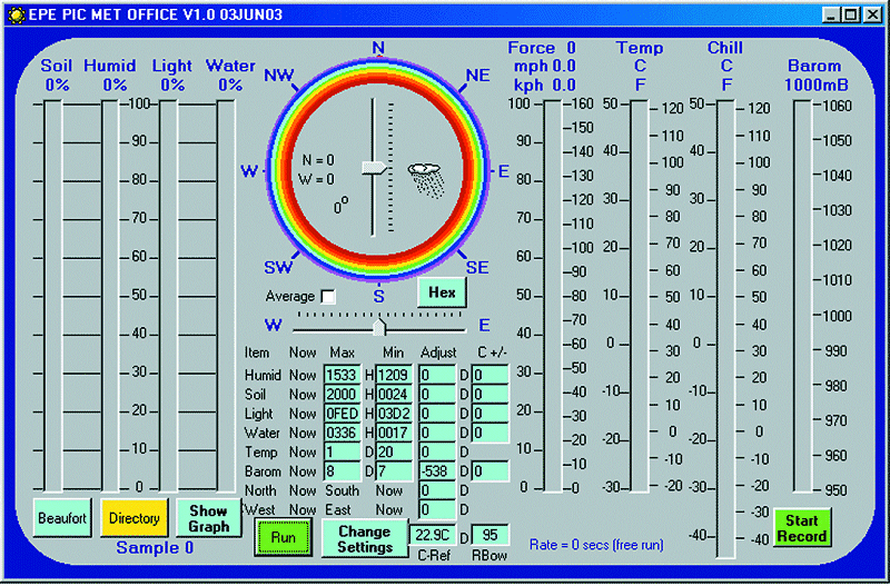 EPE 'PIC' Met Office - EPE does it again! Our very latest PIC-powered 'Met Office' Weather Station (so-called after the UK Gov't Meteorological Office) is a fabulous all-solid state weather monitoring and data logging project that's guaranteed free from salty seaweed and old proverbs! The EPE PIC Met Office measures a wide variety of parameters, including: Barometric pressure in millibars | Temperature in Celsius and Fahrenheit | Relative Humidity %RH | Soil Mositure % | Light Intensity % | Rain Fall immediate and trends | Wind Speed in kph, mph, Beaufort Scale | Wind Direction | Wind Chill Factor | Possible Rainbow Alert!